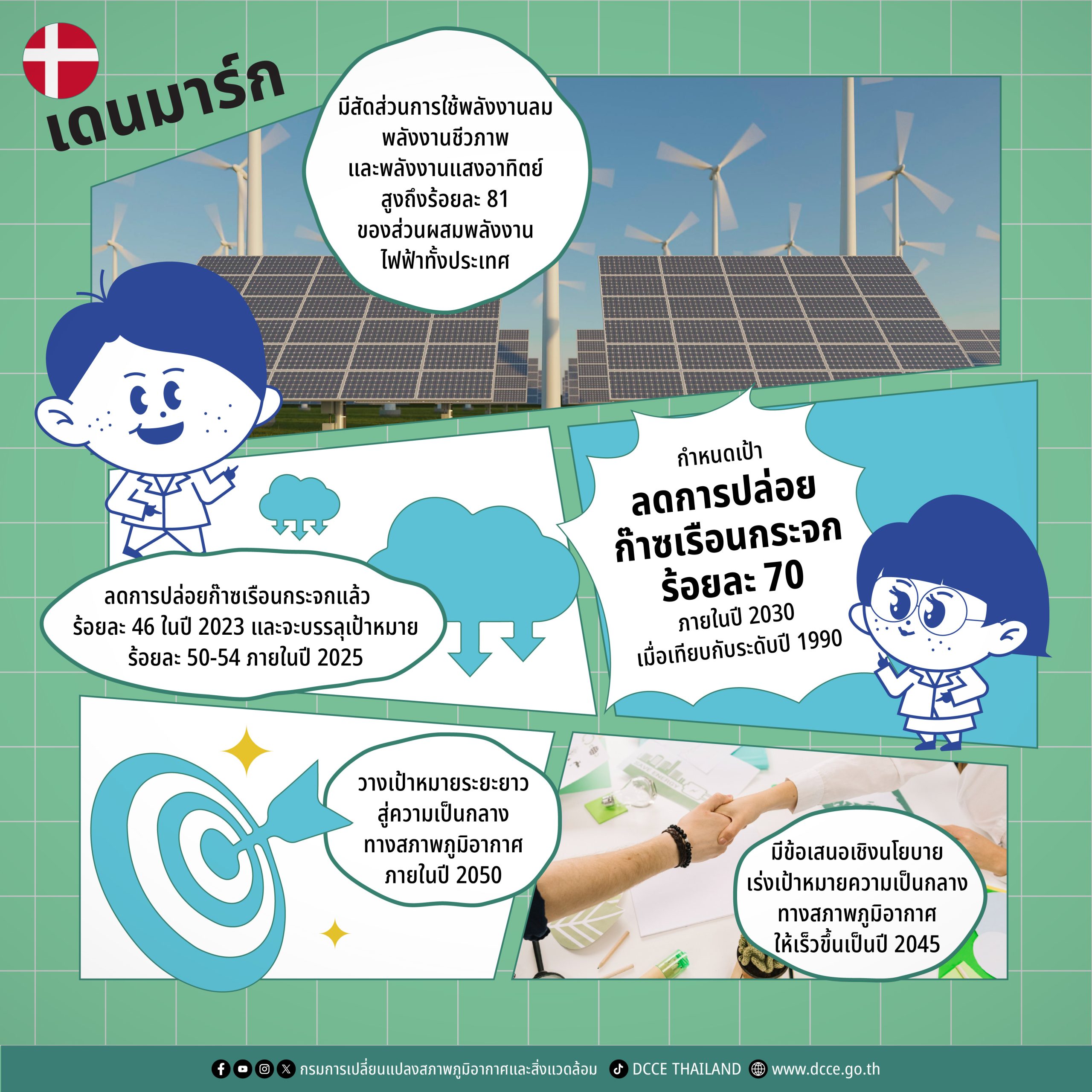 เดนมาร์กถือเป็นผู้นำด้านการลดคาร์บอนและเป็นแรงบันดาลใจให้หลายประเทศทั่วโลก ภายใต้กฎหมายสภาพภูมิอากาศปี 2020 (Climate Act 2020) รัฐบาลได้กำหนดเป้าหมายที่มีผลผูกพันทางกฎหมายในการลดการปล่อยก๊าซเรือนกระจกลงร้อยละ 70 ภายในปี 2030 เมื่อเทียบกับระดับปี 1990 พร้อมวางเป้าหมายระยะยาวสู่ความเป็นกลางทางสภาพภูมิอากาศภายในปี 2050 ขณะเดียวกัน ยังมีข้อเสนอเชิงนโยบายให้เร่งเป้าหมายความสมดุลทางสภาพภูมิอากาศให้เร็วขึ้นเป็นปี 2045 (1)(2)