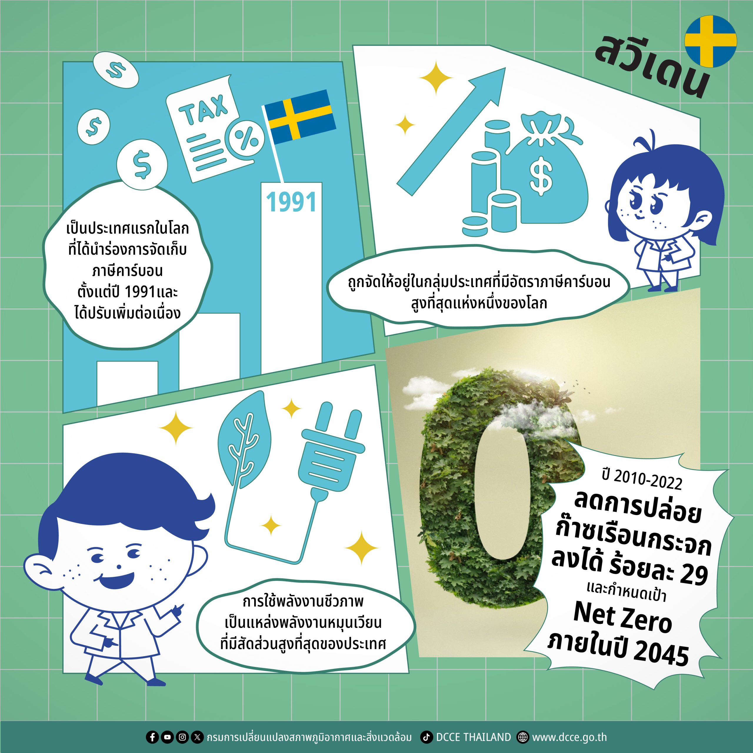โดยเฉพาะอย่างยิ่ง สวีเดนเป็นประเทศแรกในโลกที่ได้นำร่องการจัดเก็บภาษีคาร์บอน ตั้งแต่ปี 1991 และได้ปรับเพิ่มอัตราภาษีดังกล่าวอย่างต่อเนื่อง ซึ่งเป็นเครื่องมือสำคัญในการสนับสนุนให้เกิดการเปลี่ยนผ่านด้านสิ่งแวดล้อม อัตราภาษีคาร์บอนในปัจจุบันสำหรับเชื้อเพลิงฟอสซิลส่วนใหญ่อยู่ที่ 1,510 โครนสวีเดนต่อการปล่อย CO₂ ต่อตัน (เทียบเท่าประมาณ 134 ยูโรต่อตันในปี 2025) (7)
