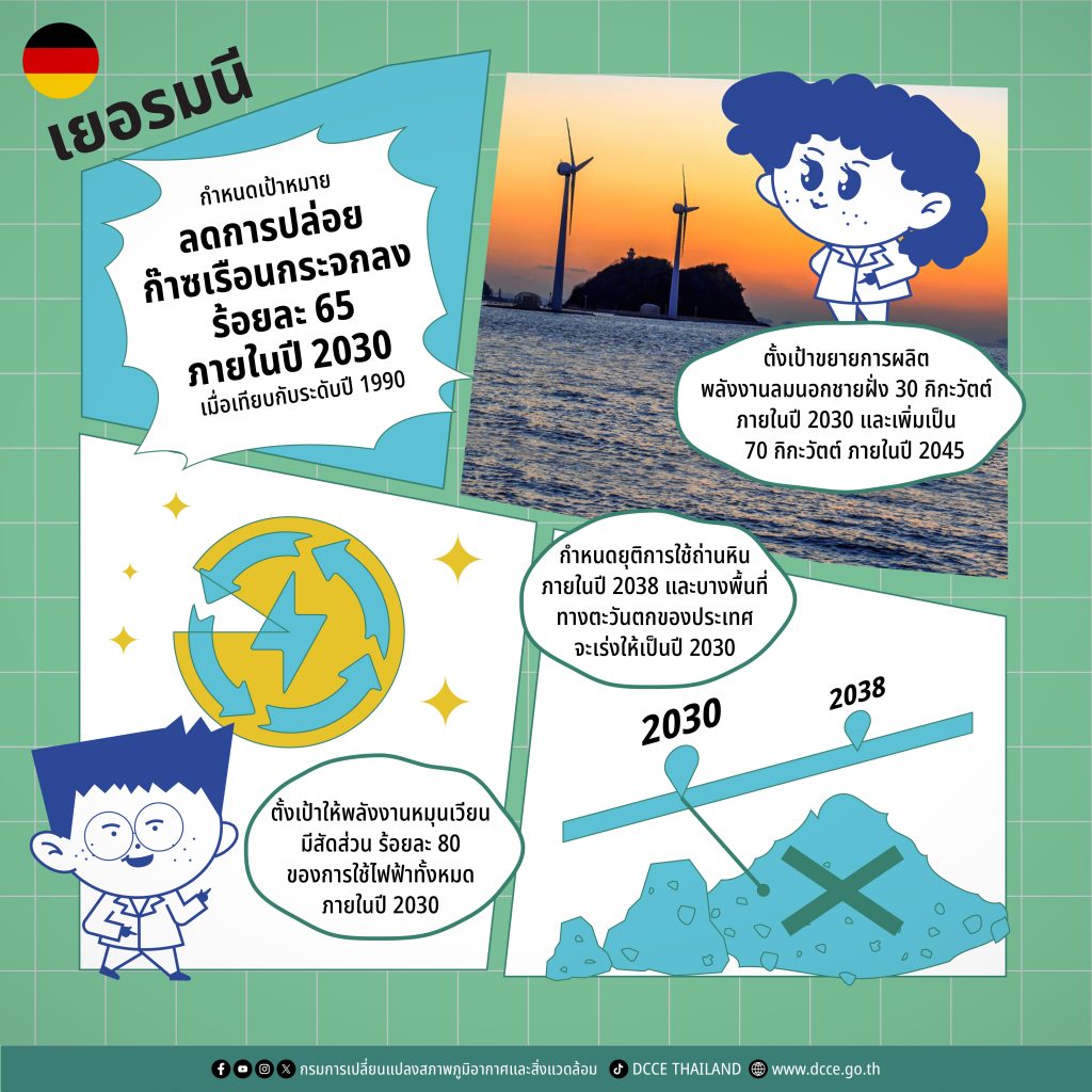 เยอรมนีเดินหน้าขับเคลื่อนยุทธศาสตร์การเปลี่ยนผ่านพลังงานภายใต้นโยบาย “Energiewende” อย่างจริงจังและต่อเนื่อง โดยการแก้ไขกฎหมายสภาพภูมิอากาศในปี 2021 (Climate Change Act 2021) ได้ตอกย้ำความมุ่งมั่นของรัฐบาลในการบรรลุความเป็นกลางทางก๊าซเรือนกระจกภายในปี 2045 อย่างชัดเจน (9)(10)(11)