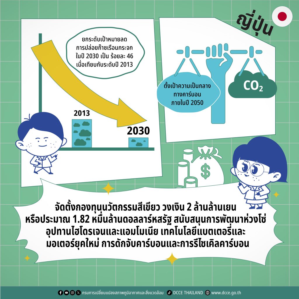 ญี่ปุ่นเป็นอีกหนึ่งผู้นำในภูมิภาคเอเชียที่ตั้งเป้าหมาย ความเป็นกลางทางคาร์บอนภายในปี 2050 พร้อมยกระดับเป้าหมายการลดการปล่อยก๊าซเรือนกระจกในปี 2030 เป็นร้อยละ 46 เมื่อเทียบกับระดับปี 2013 เพื่อสนับสนุนเป้าหมายดังกล่าว รัฐบาลได้ขับเคลื่อน “ยุทธศาสตร์การเติบโตสีเขียวเพื่อบรรลุความเป็นกลางทางคาร์บอนปี 2050” (Green Growth Strategy) ซึ่งถือเป็นการปรับมุมมองจากการมองการแก้ปัญหาโลกร้อนเป็นต้นทุน มาเป็นโอกาสในการสร้างการเติบโตทางเศรษฐกิจในระยะยาว (14)(15)(16)