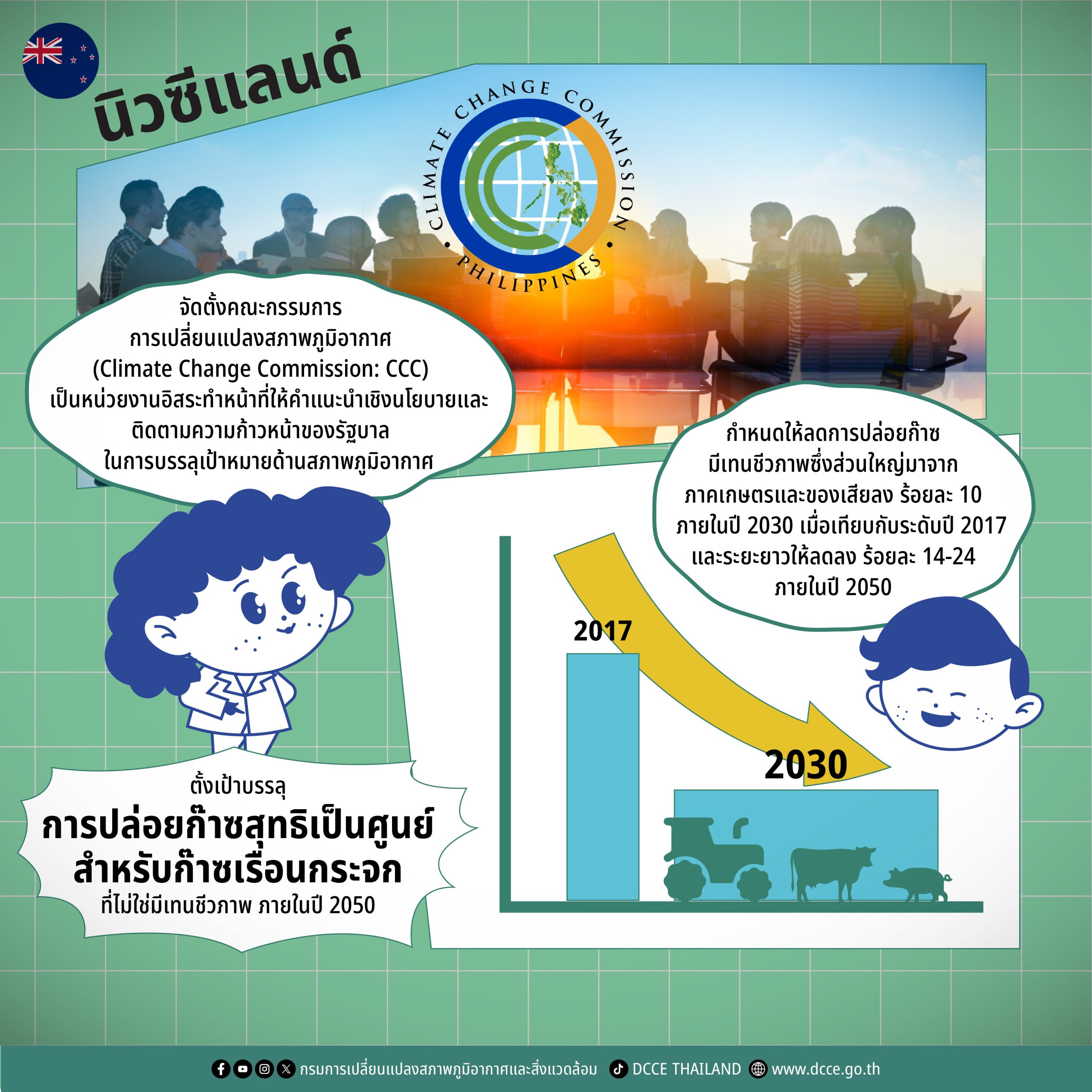 จุดเด่นของนิวซีแลนด์อยู่ที่การใช้แนวทาง “การแบ่งแยกก๊าซ” (Split Gas Approach) ในการกำหนดเป้าหมายการลดการปล่อย โดยยอมรับว่าก๊าซมีเทนชีวภาพ (Biogenic Methane) ซึ่งมีอายุสั้น ส่งผลต่อภาวะโลกร้อนแตกต่างจากก๊าซเรือนกระจกอายุยาวอย่างคาร์บอนไดออกไซด์ เป้าหมายหลักของประเทศคือการบรรลุการปล่อยก๊าซสุทธิเป็นศูนย์สำหรับก๊าซเรือนกระจกที่ไม่ใช่มีเทนชีวภาพภายในปี 2050 (18)