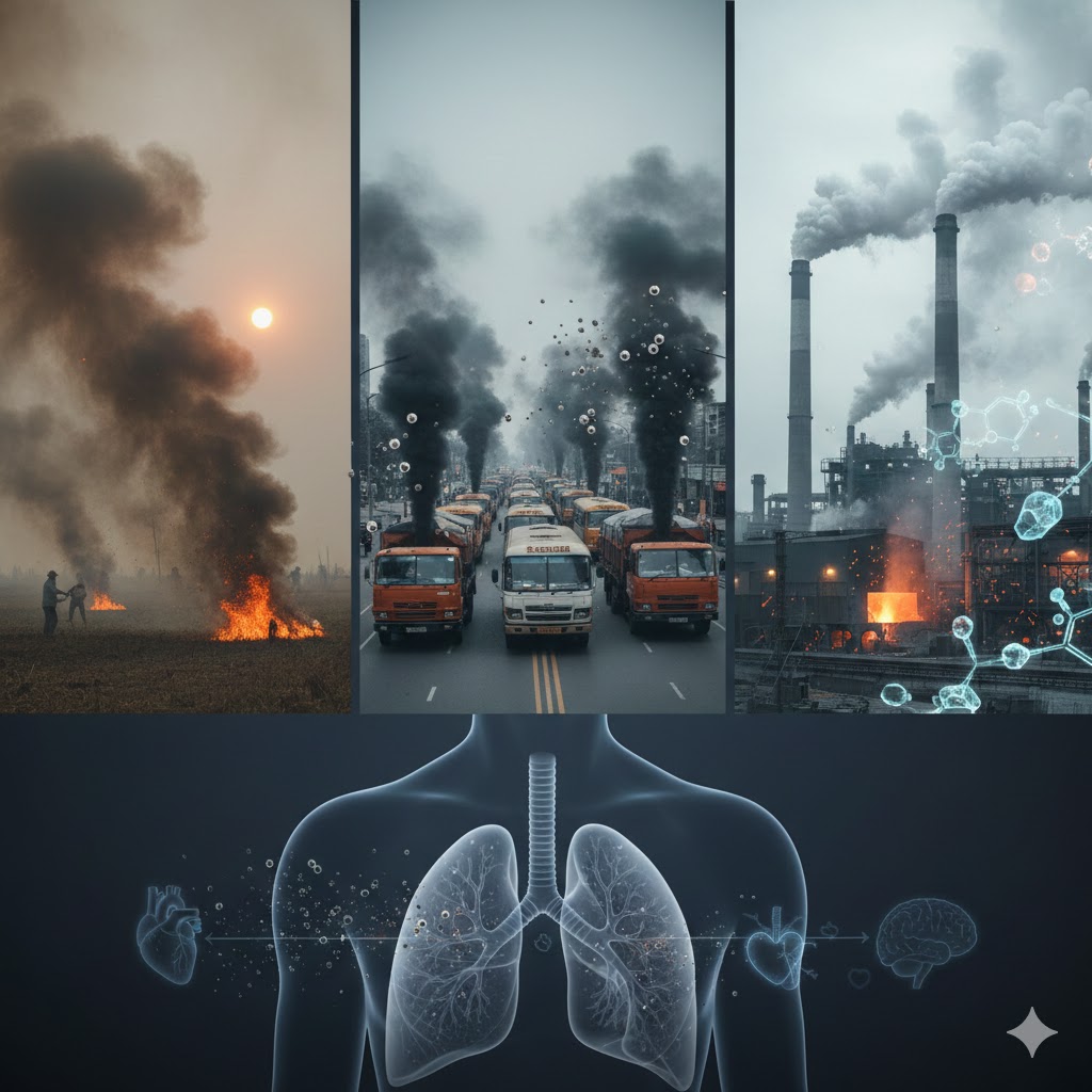 - การเผาในที่โล่ง (เกษตร/ขยะ/ป่า): โดดเด่นด้านปริมาณที่มหาศาล กระจายวงกว้าง มีคาร์บอนอินทรีย์และสารก่อมะเร็งกลุ่ม PAHs สูง มักทำให้เกิดการอักเสบเฉียบพลันในระบบทางเดินหายใจ