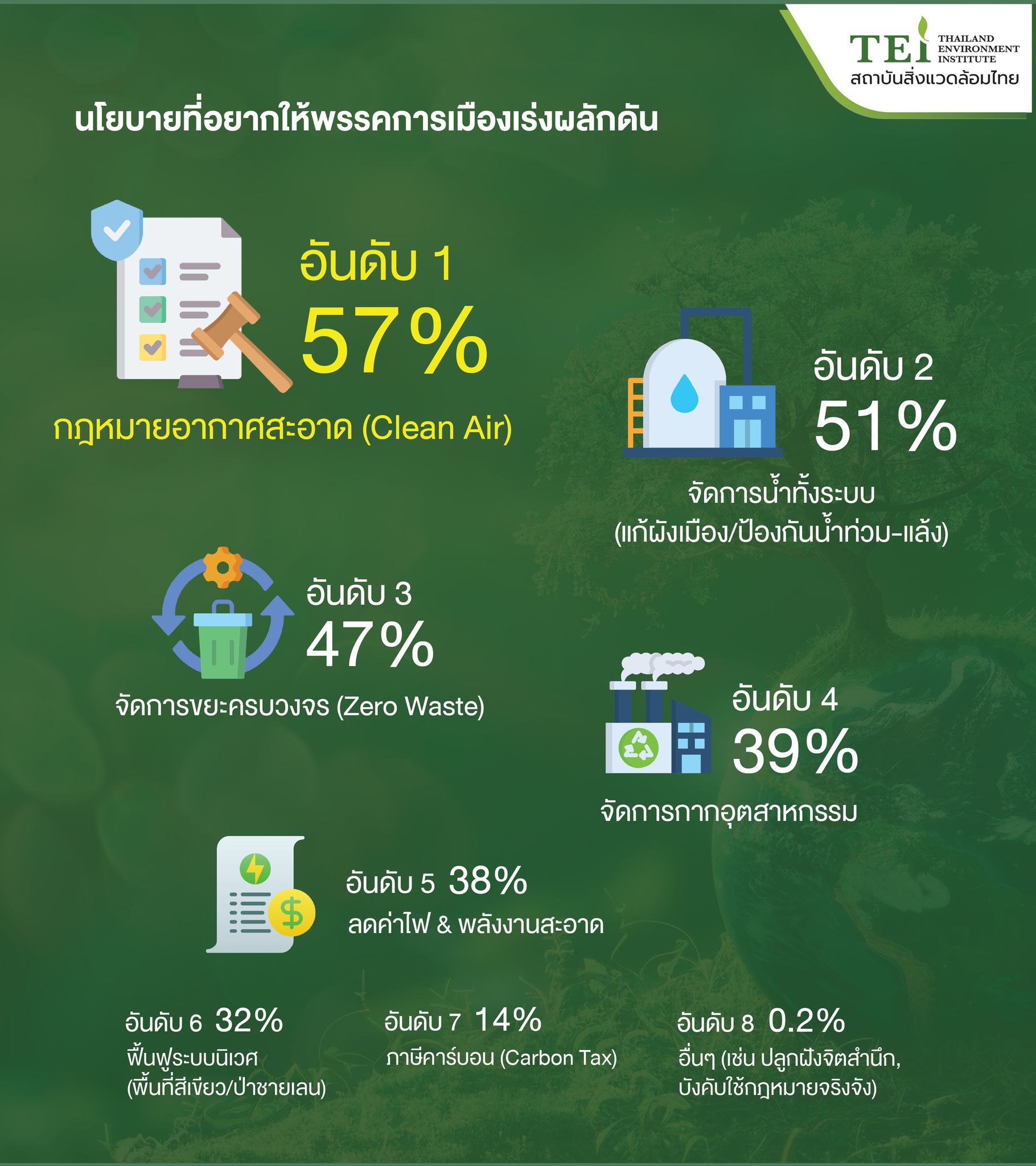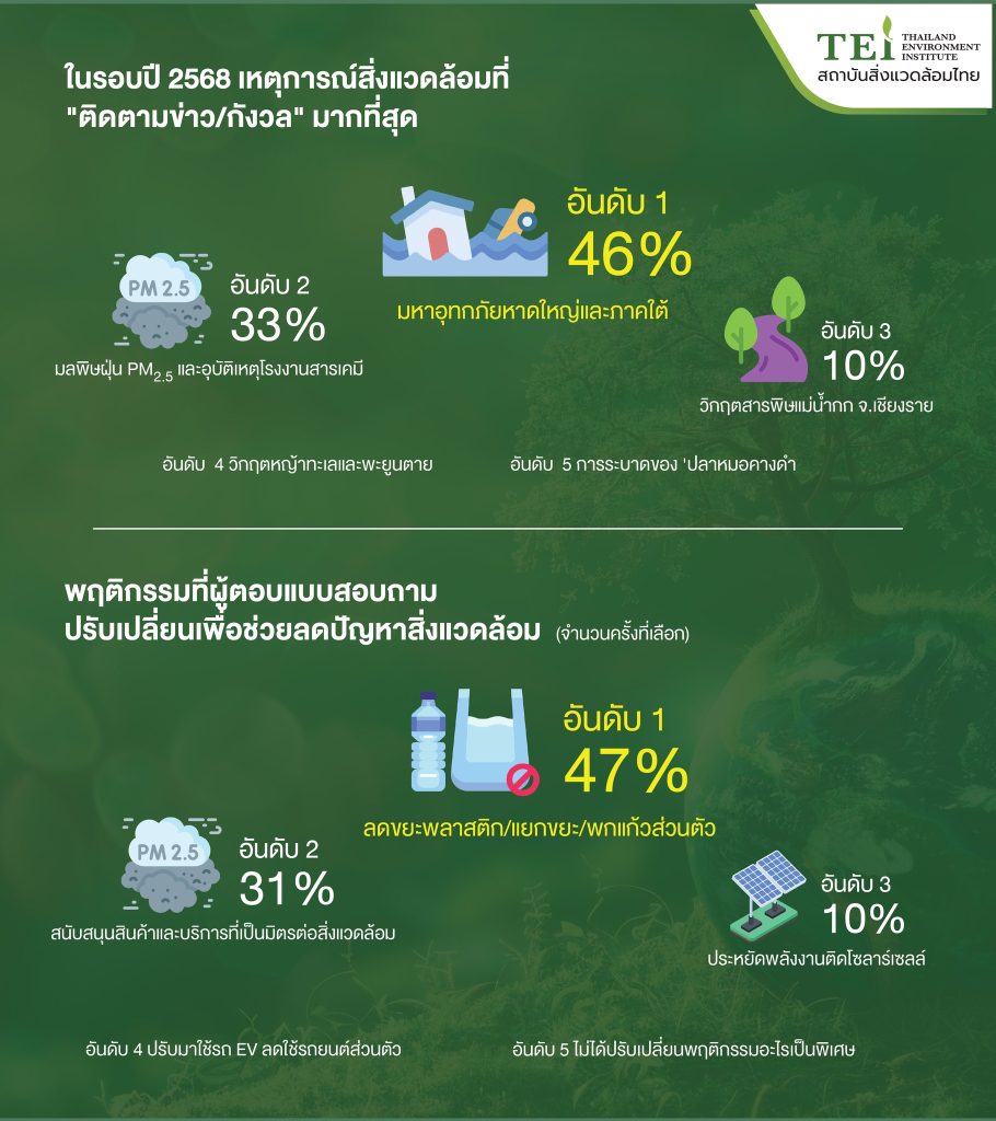 สถาบันสิ่งแวดล้อมไทย (TEI) เผยผลสำรวจ “เสียงคนไทย 2568” พบประชาชนกว่า 88% บอบช้ำจากปัญหาสิ่งแวดล้อม จี้พรรคการเมืองดัน “กฎหมายอากาศสะอาด-จัดการน้ำ-Zero Waste” เป็นวาระแห่งชาติรับเลือกตั้ง 2569
