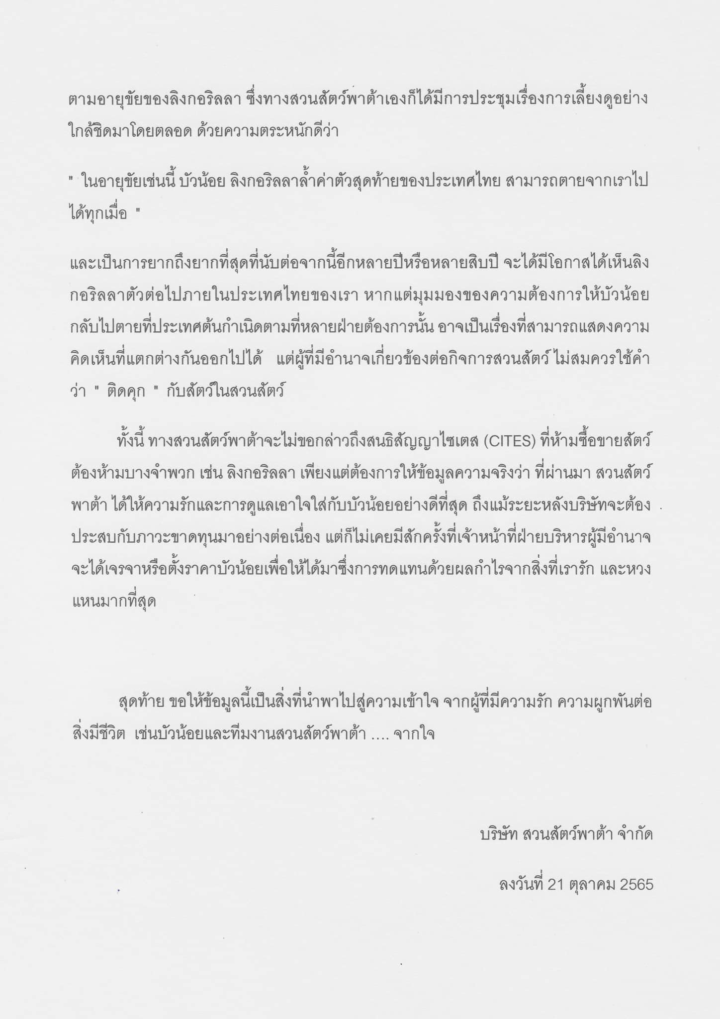 ทั้งนี้ ทางสวนสัตว์พาต้าจะไม่ขอกล่าวถึงสนธิสัญญาไซเตส (CITES) ที่ห้ามซื้อขายสัตว์ต้องห้ามบางจำพวก เช่น ลิงกอริลลา เพียงแต่ต้องการให้ข้อมูลความจริงว่า ที่ผ่านมาสวนสัตว์พาต้าได้ให้ความรักและการดูแลเอาใจใส่กับบัวน้อยอย่างดีที่สุด แม้ระยะหลังบริษัทจะต้องประสบกับภาวะขาดทุนมาอย่างต่อเนื่อง แต่ก็ไม่เคยมีการเจรจาหรือตั้งราคาบัวน้อยเพื่อผลกำไร