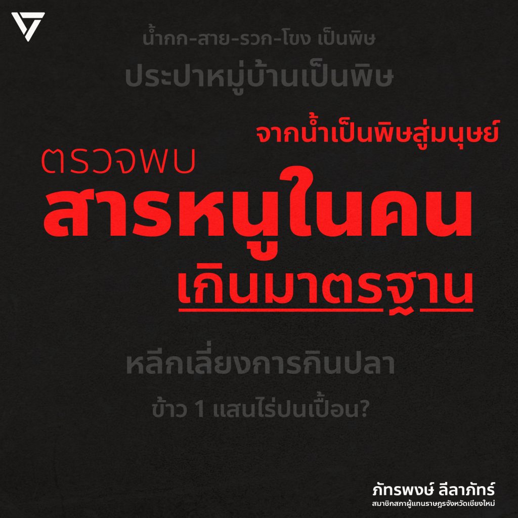 ภัทรพงษ์ ลีลาพัฒน์ สส. เชียงใหม่ รองโฆษกพรรคประชาชน โพสต์ถึงปัญหามลพิษในแม่น้ำกก-สาย-รวก ที่ส่งผลกระทบรุนแรงต่อประชาชน โดยระบุว่า จากน้ำเป็นพิษสู่มนุษย์ ตรวจพบสารหนูในคนพื้นที่ใช้น้ำกก-สาย ค่าสารหนูเกินเกณฑ์ ปัญหาเร่งด่วนที่รัฐบาลเชื่องช้า และรองนายกฯลงพื้นที่แต่ไม่พูดถึงปัญหา ต้องให้หนักขึ้นอีกเท่าไหร่ ถึงจะทำงานเป็น