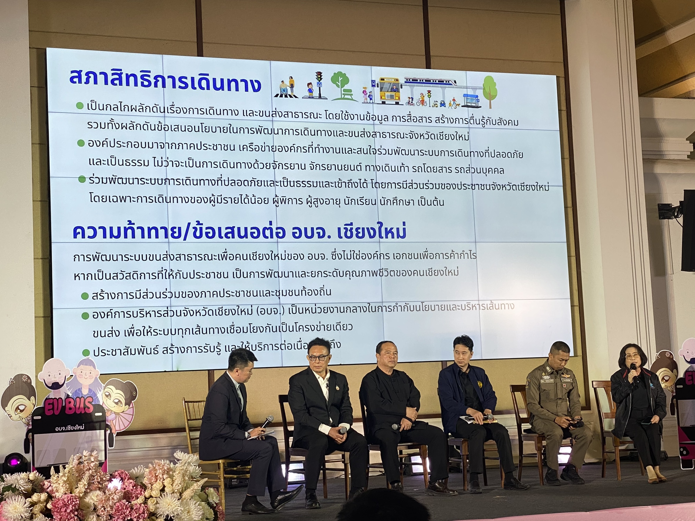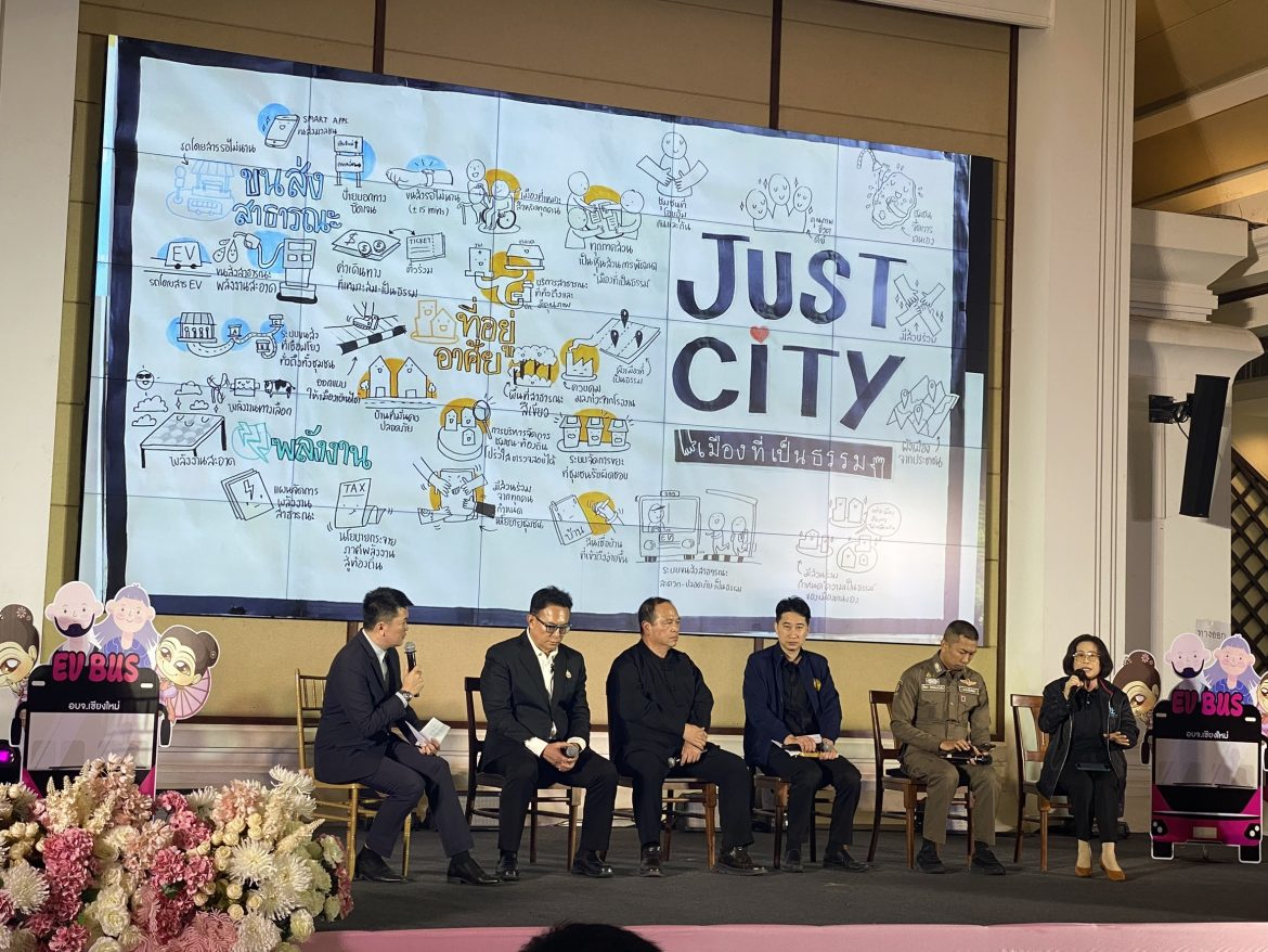 พลังภาคประชาชนสู่ Just City เมืองที่เป็นธรรม ภายในงานยังมีการเสวนาหัวข้อ “โอกาสและความท้าทายของเมืองต้นแบบกับการพัฒนาระบบขนส่งสาธารณะ EV Bus ในเขตเมืองเชียงใหม่” โดยตัวแทนจากสภาสิทธิการเดินทางและเครือข่ายผู้บริโภคจังหวัดเชียงใหม่ ได้ร่วมสะท้อนความต้องการของภาคประชาชน โดยเน้นย้ำว่าระบบขนส่งสาธารณะควรเป็น “สวัสดิการพื้นฐาน” ที่ทุกคนต้องเข้าถึงได้อย่างเท่าเทียม