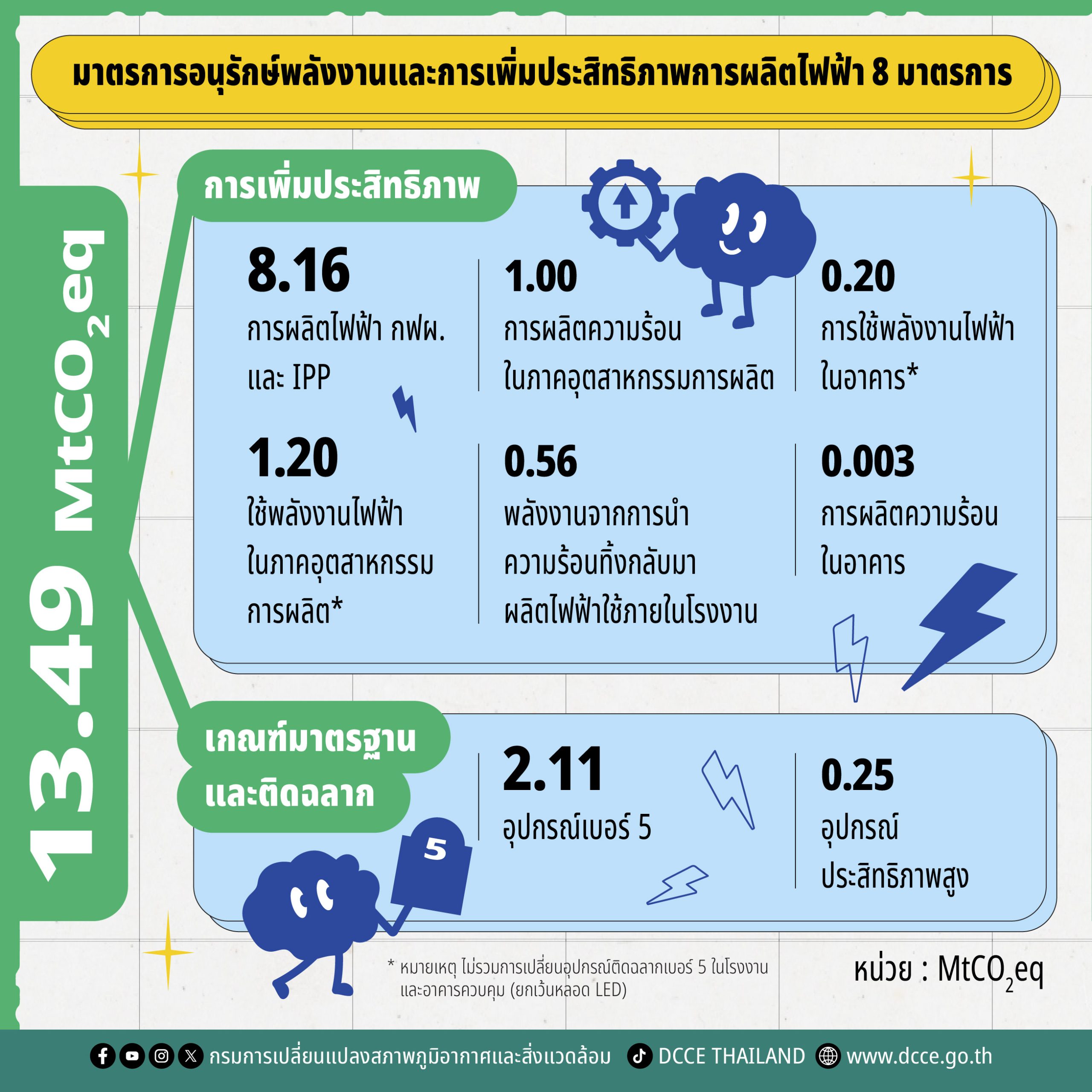 มาตรการอนุรักษ์พลังงานและการเพิ่มประสิทธิภาพการผลิตไฟฟ้า 8 มาตรการ = 13.49 MtCO2eq