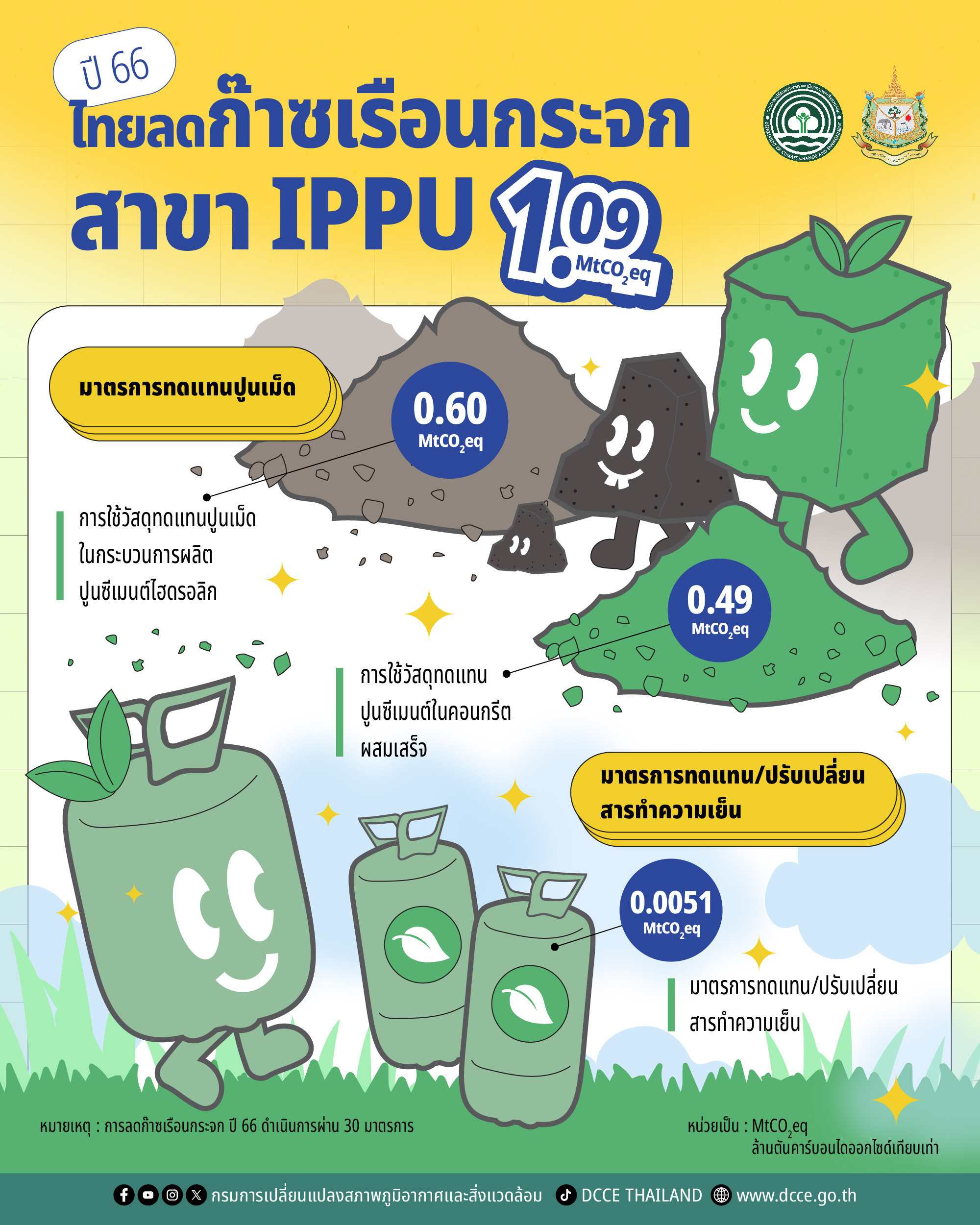 ด้านสาขากระบวนการอุตสาหกรรมและการใช้ผลิตภัณฑ์ หรือ IPPU เป็นอีกหนึ่งสาขาที่ช่วยลดโลกร้อนได้เช่นกัน ด้วยการใช้วัสดุทดแทนปูนเม็ดและปูนซีเมนต์ที่สามารถลดก๊าซเรือนกระจกได้ 1.06 MtCO2eq เช่นเดียวกับการใช้มาตรการทดแทน/ปรับเปลี่ยนสารทำความเย็นที่ลดก๊าซเรือนกระจกได้ 0.0051 MtCO2eq