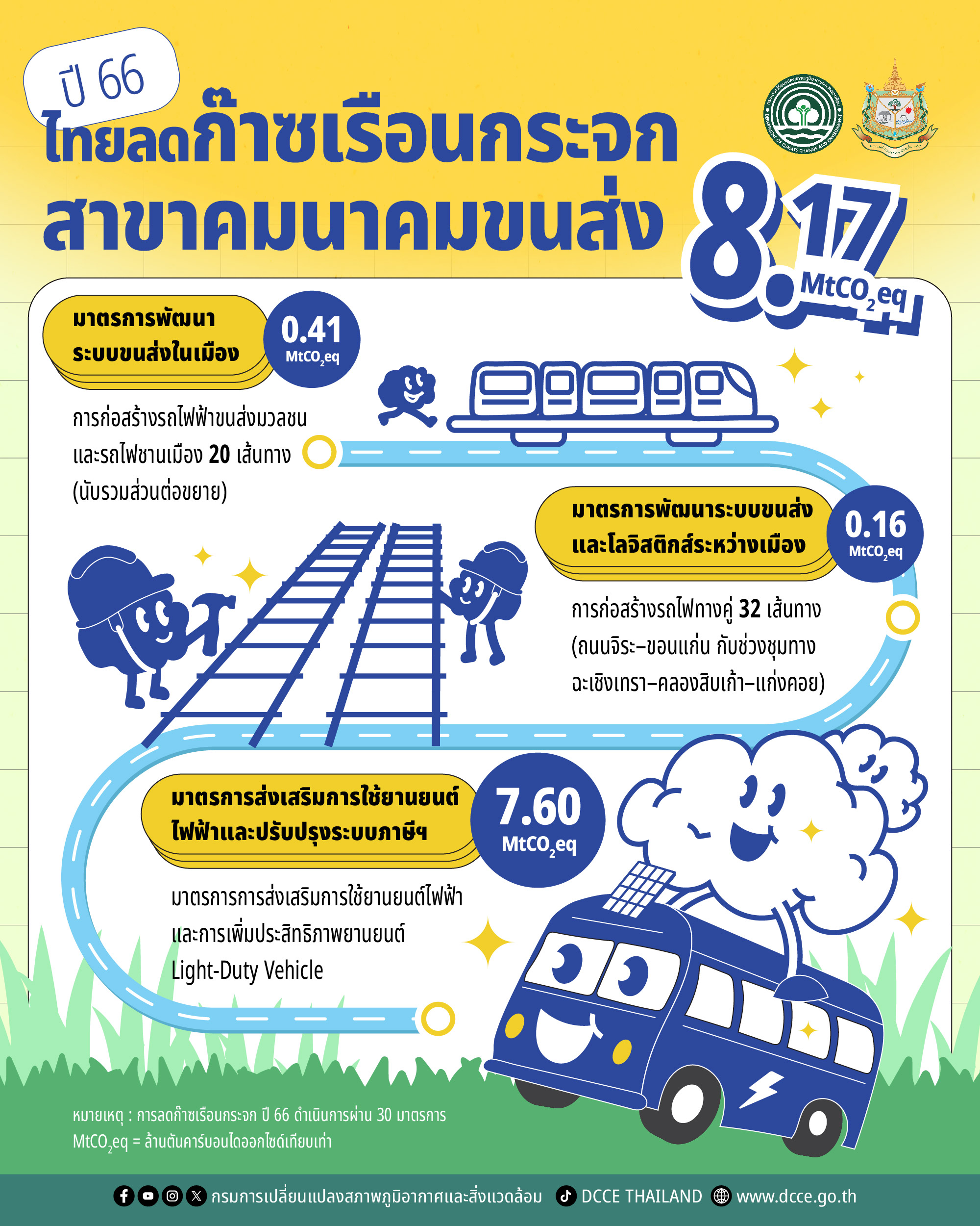 สำหรับสาขาคมนาคมขนส่ง พบว่าการใช้มาตรการการส่งเสริมการใช้ยานยนต์ไฟฟ้าและการเพิ่มประสิทธิภาพยานยนต์ สามารถลดก๊าซเรือนกระจกได้มากที่สุดเท่ากับ 7.60 MtCO2eq ขณะที่ทุกมาตรการรวมกันเฉพาะในสาขานี้ สามารถลดก๊าซเรือนกระจกได้ 8.17 MtCO2eq