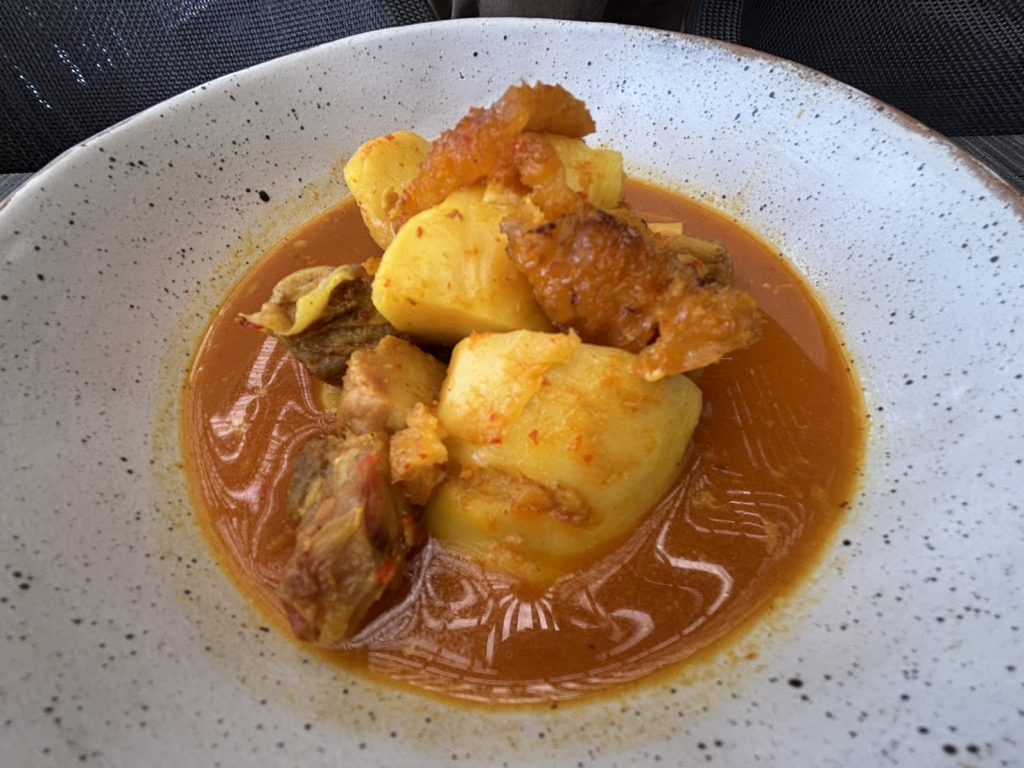 “หมูย่างต้องกินตอนเช้าเพราะจะไม่อร่อย เช่น ร้านโกเภา (มีชื่อเป็นที่นิยม) ต้องไปเช้ามาก ถ้าไม่จองไม่ได้กิน เนื่องจากนักท่องเที่ยวจะตื่นไปกินไม่ทัน เราจึงผุดไอเดียแกงส้มหมูย่างที่ใช้พริกแกงตำมือจากตลาดนาโยงที่มีชื่อดังมาก ขายทั่วทั้งจังหวัด เราใส่ทุเรียนลงไปด้วย พอฝนตกลมแรง ทุเรียนตกก่อนก็นำมาใส่ในแกงส้ม โดยได้แรงบันดาลใจจากจันทบุรีที่เขาเอาไปใส่ในมัสมั่น