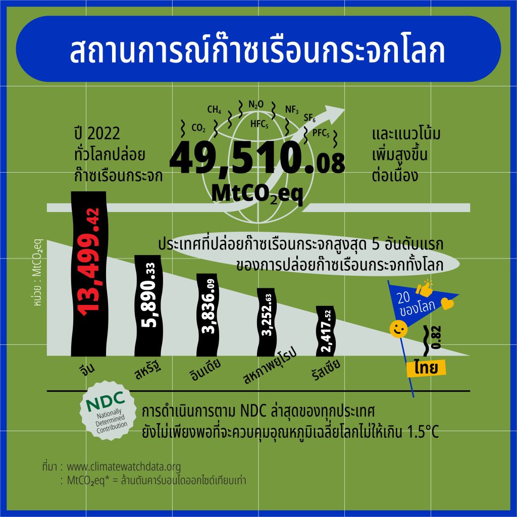 - ปี 2022 ทั่วโลกปล่อยก๊าซเรือนกระจก 49,510.08 MtCO₂eq และแนวโน้มเพิ่มสูงขึ้นต่อเนื่อง